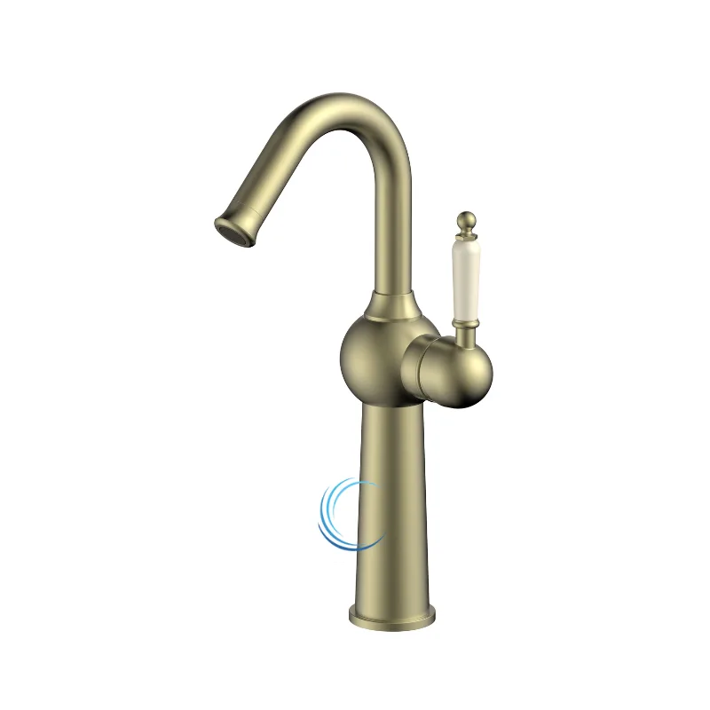 ברז פרח גבוה ברבור 6421 לכיור מונח בגוון זהב מט ידית חרס לבנה