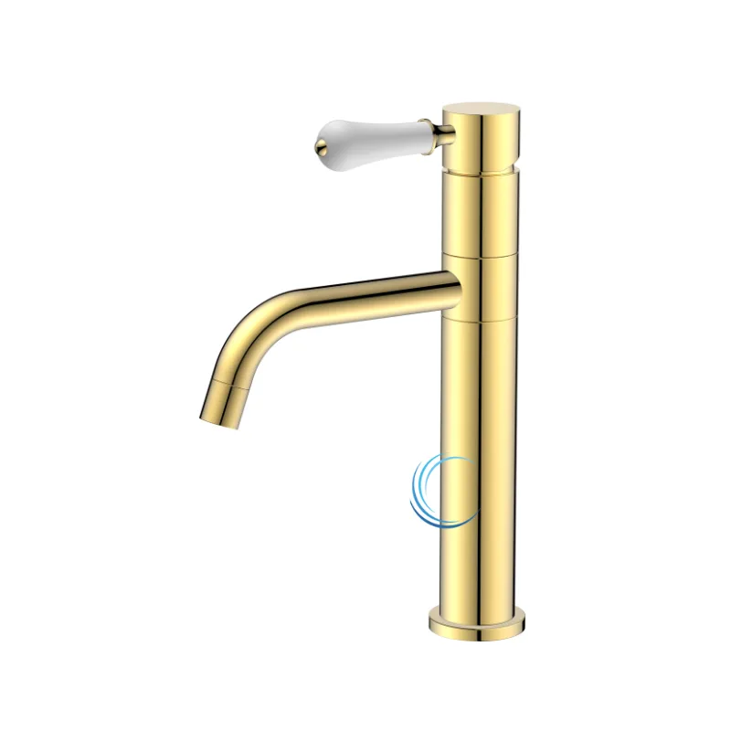 ברז נמוך לכיור שקוע מסתובב זהב מבריק ידית חרס לבנה
