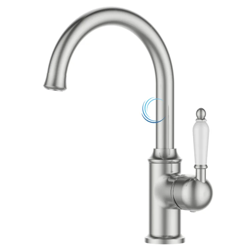 ברז מעוצב לכיור שקוע ניקל מוברש ידית חרס לבנה