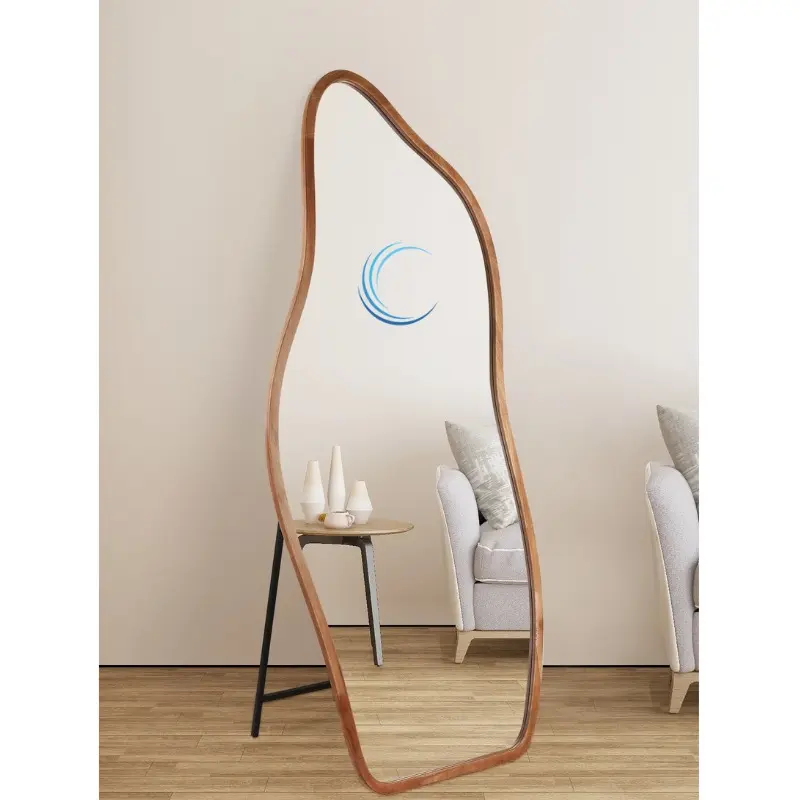 מראת גוף אמורפית עם מסגרת עץ גוון עץ טבעי עם רגל-