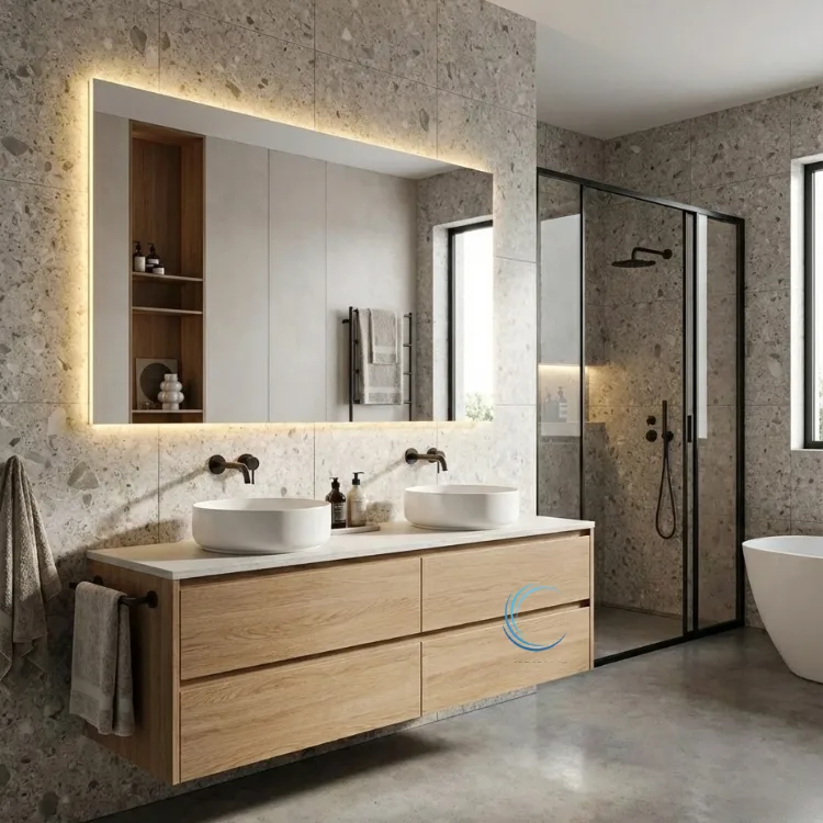 מראה מרחפת מהקיר עם תאורה: מגיעה עם מסגרת ייעודית הכוללת פס לד מוגן מים ושנאי לתאורה נסתרת.
